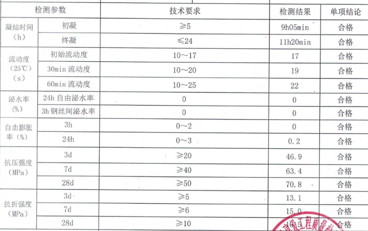 用于后張梁預(yù)應(yīng)力管道充填的壓漿材料、防止預(yù)應(yīng)力鋼材的防腐、保證預(yù)應(yīng)力束與混凝土結(jié)構(gòu)之間有效的應(yīng)力傳遞,使孔道內(nèi)漿體飽滿密實(shí),漿體保持一定的PH值范圍,完全包裹預(yù)應(yīng)力鋼材,漿體硬化后有較高的強(qiáng)度和彈性模量及膨脹無(wú)收縮性和粘接力。