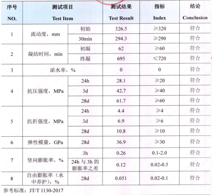 5、灌漿料抗油滲:在機(jī)油中浸泡30天后其強(qiáng)度比浸油前提高10%以上。